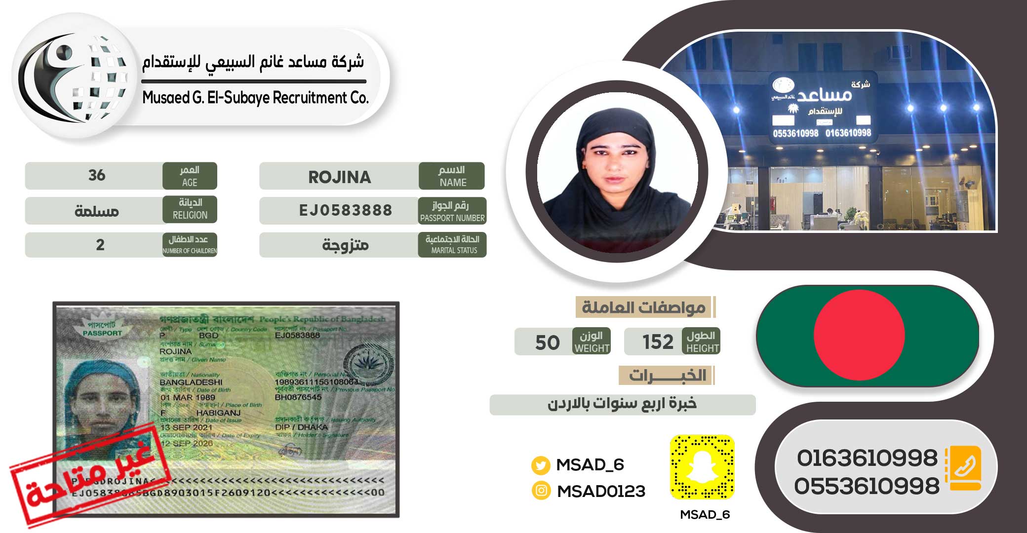 إسمي روجينا متزوجة من بنجلاديش و عمري 36 سنة و لدي خبرة في العمل بمنطقة الخليج و أجيد بعض الجمل البسيطة العربية و الإنجليزية و اللغة المحلية و مستعدة للعمل كعاملة منزلية راسلني الآن