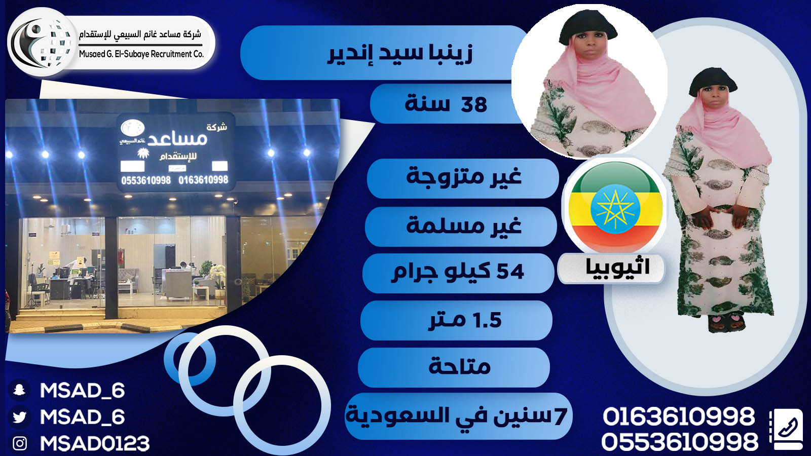 إسمي زينبا سيد إندير عزباء من أثيوبيا و عمري 38 سنة و لدي خبرة في العمل بمنطقة الخليج و أجيد بعض الجمل البسيطة العربية و الإنجليزية و اللغة المحلية و مستعدة للعمل كعاملة منزلية